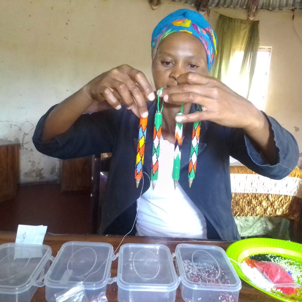 The art of using glass beads to make jewelry of all kinds has a long tradition in South Africa. Bead art began as early as in the 16th century, as colonial powers used glass beads in exchange for ivory, wild animal skins and livestock. The works of art made from glass beads served not only as jewelry, but also for communication or signaling.Thus, the colors and shapes of the jewelry signaled characteristics of the wearer. The term jewelry was much broader than today. For example, entire garments were made of glass beads. Today, beadwork is a South African work of art, made predominantly by women. By selling the beadwork, the women can contribute to the family income.