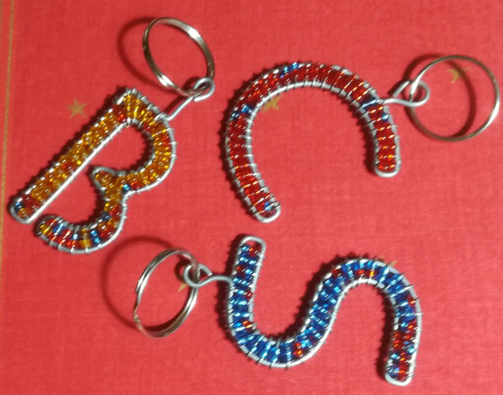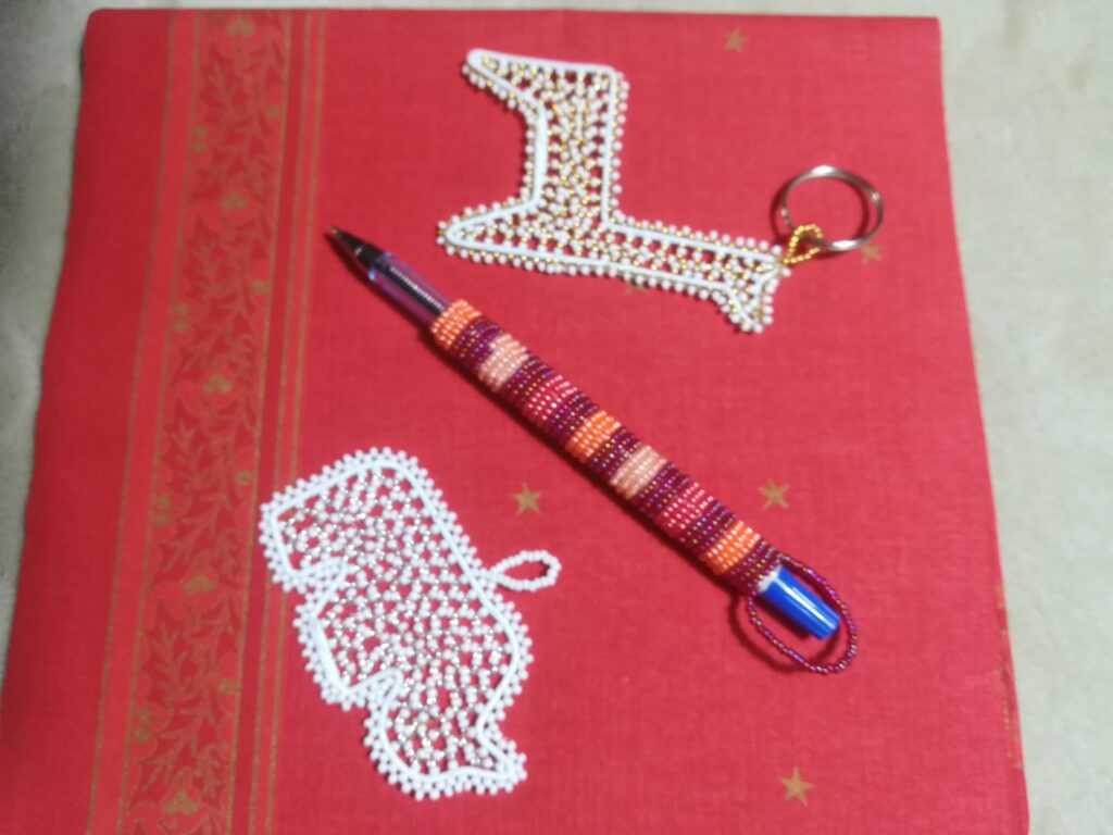 Beadwork can be used in many ways for embellishment. For example, there are key chains of different shapes or writing utensils, which are wrapped with beads.